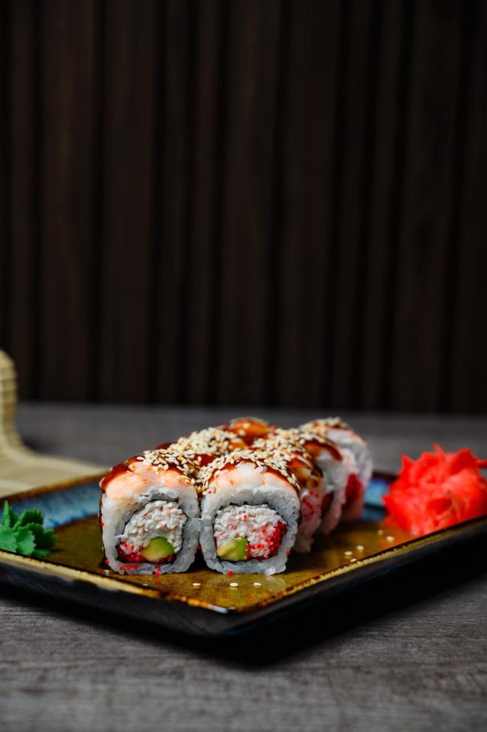 Рис, нори, авокадо, краб, креветка, унаги соус, кунжут, тобико