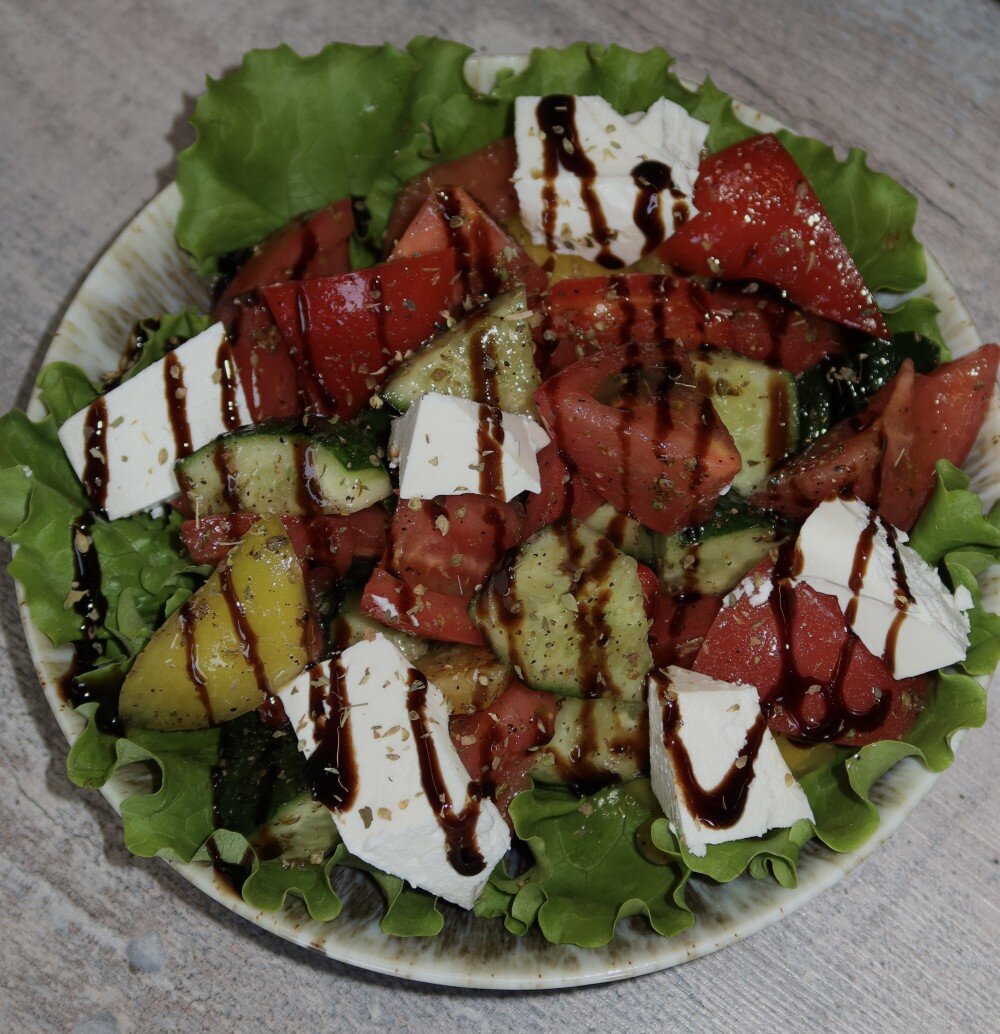 сыр Брынза, помидор, огурец, маслины, болгарский перец, масло оливковое, соус бальзамический соль, итальянские травы, перец черный,романо