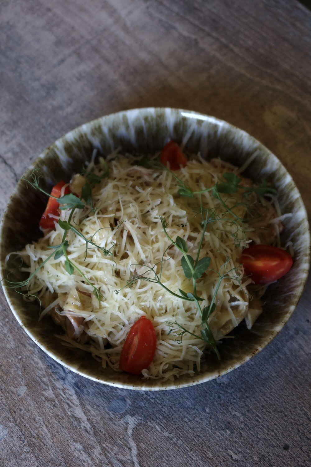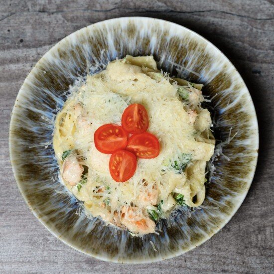 макароны феттучини, ветчина из индейки, бекон, сливки петмол, сыр пармезан, помидоры черри, масло сливочное