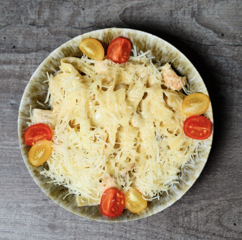 Макароны феттучини, лосось, креветка, сливки петмол, сыр пармезан, помидоры черри, масло сливочное, розмарин, шпинат