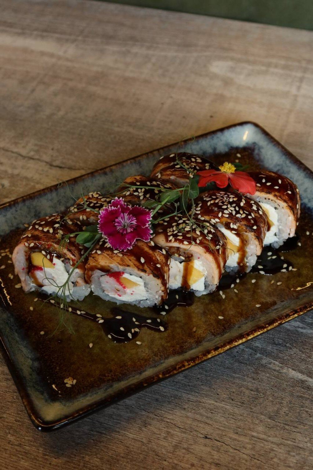 Рис, нори, краб, манго, креветка, унаги соус, кунжут, лосось, тобико