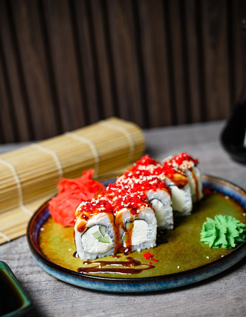 Рис, нори, сыр, креветка, огурец, унаги соус, кунжут, тобико